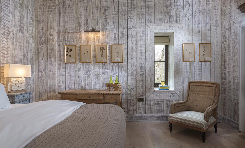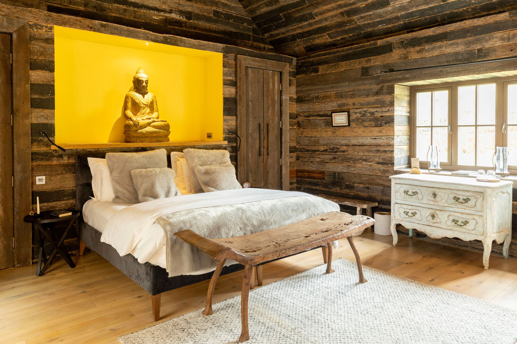 In addition to the pod, there is a welcoming ‘contemplation couch’ on which guests can relax and recharge post coastal hike or massage. The cottage overlooks the fields and organic orchard filled with apple, pear and cherry trees right outside the floor-to-ceiling windows. In the bedroom, the walls have been clad with reclaimed dark Kentucky oak wood giving it a true rustic luxury feel, perfect for a great night’s sleep. Above the super-king size bed sits a 300yr old antique hand-carved stone Buddha sourced from Indonesia.
