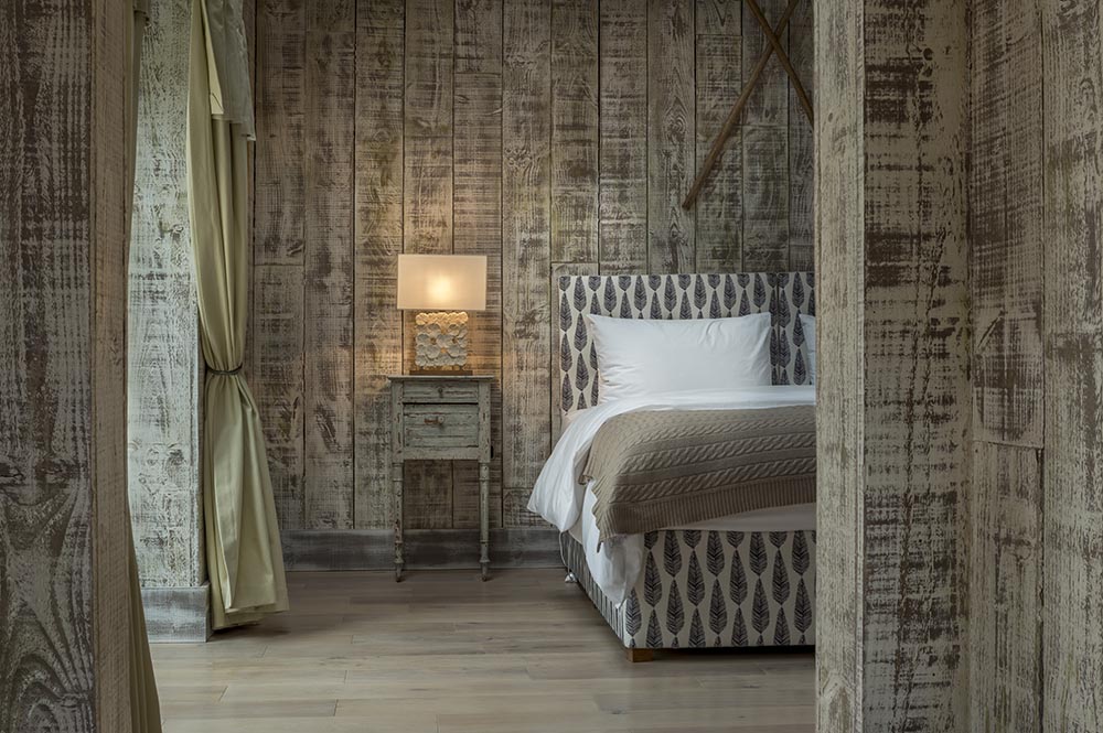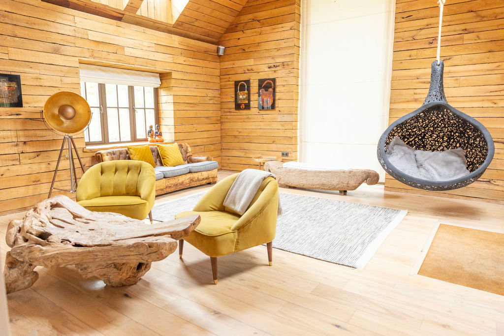Spanning 1400sq ft., the ‘Love and Be Loved’ cottage has a large bedroom with a super king-sized bed which can be split into two twin beds if sharing with a friend. The bathroom is tiled with polished white stone from floor to ceiling with a separate luxuriant stone bath and power shower. The central feature of the cottage is the large double-sided fireplace, which serves both the bedroom and the living room. Completing this luxuriously rustic chic cottage is a swaying meditation pod created from volcanic ash.